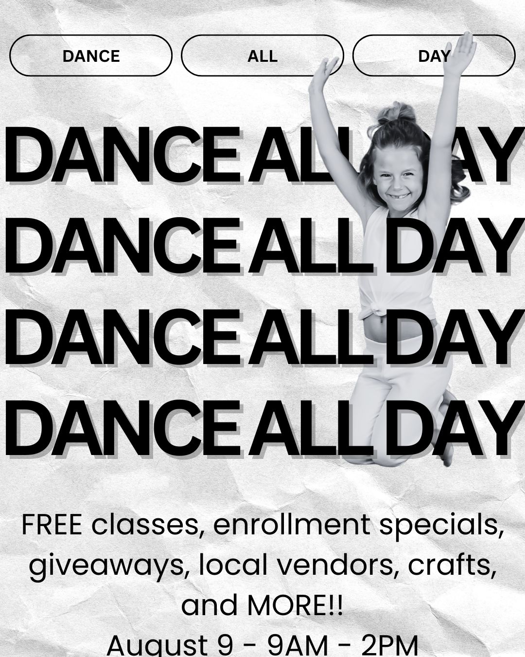 Dancers of all ages are invited to enjoy FREE classes from 9am–2pm, plus fun treats and special surprises.